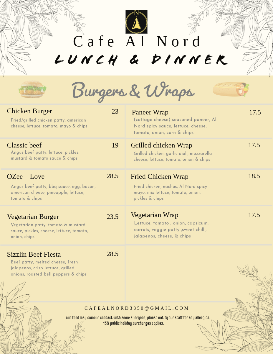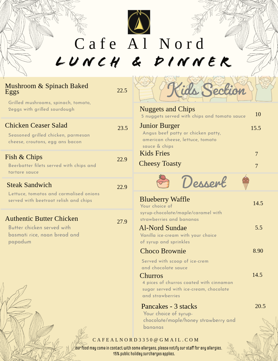 Desserts at Cafe Al Nord are a must-try! The Blueberry Waffle drizzled with your choice of syrup, served alongside strawberries and bananas, is simply divine for A$14.50. Or, revel in the classic AlNord Sundae for a sweet treat at just A$5.50. Each bite is crafted to elevate your dining experience and provide a comforting finish to your meal.